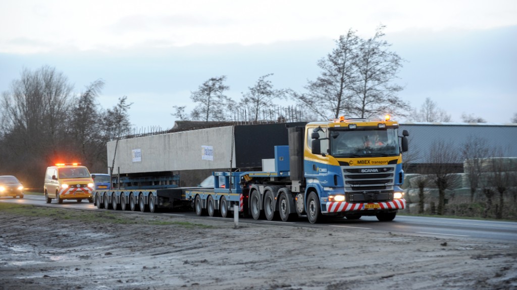 The semi-trailer can be divided into a three-axle and seven-axle semi-trailer or used as a ten-axle semi-trailer. Although the length is variable, what is referred to a spacer can be inserted to increase the length of the SL-Trailer even further. “It's a kind of table that can be inserted as required. This SL-Trailer offers us to the answer to almost all our exceptional transports.” Luitzen finds that the greatest difference from the first SL-Trailer lies in the operation of the semi-trailer. “It's clear that extra development work has taken place in the past three years, as everything is more refined. The operation of the crane, for example, is now much simpler. That makes the work easier.” Luitzen is by now on his way to Friesland, where he is to load a heavy concrete beam at Haitsma Beton that is destined for the new A9 motorway near Amsterdam. The semi-trailer needs to be extended by four metres to carry this heavy element, which weighs no less than 85 tonnes. The concrete element is loaded onto two supports and then secured with heavy chains. Luitzen then gets to work with a roller and wallpaper glue, since the Haitsma logo must be attached to the enormous concrete beam: Haitsma, in common with every other company, is not averse to a little publicity. Luitzen has now finished his work for the day. He will go home to sleep, and get up early tomorrow so that he can avoid the rush hour on his journey to Amsterdam.