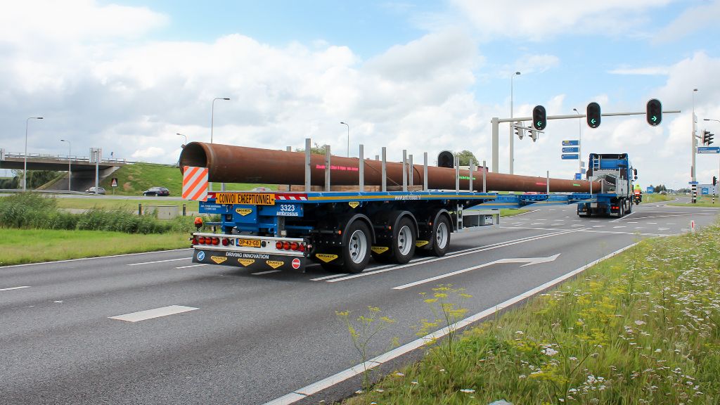 Due to the shape and the fixed bearing points, the flat extendable trailer is the most suitable. This trailer is often single or double-extendible. This can make the combination length a challenge. If the rear steering is then not enough to reach the location, supporting frames are often used on the trailer to simply load the piles over the cabin. This reduces the transport length, which makes hard-to-reach places accessible at a stroke.