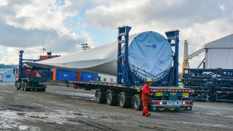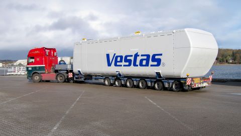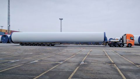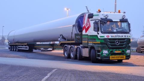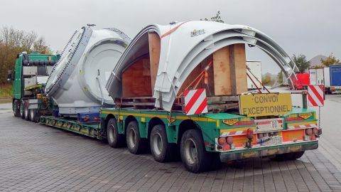 These tower sections are often transported on our triple wing carriers. This trailer is suitable for this type of tower sections (but also for a divided middle section) and for blades. This way you save on the fleet and you are multifunctional.
