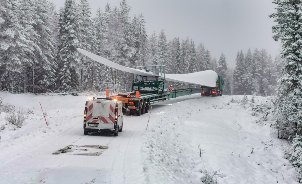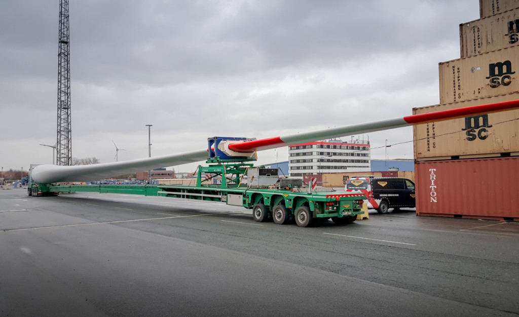 The four times extendable pendle axle blade trailer has been one of the latest innovative developments. This flat trailer can reach a length of up to 69 m and has been specially developed for transporting the blades (wings) for wind turbines. The hydraulically lifted gooseneck, together with the high stroke of the pendle axles, gives the blade trailer the advantage that the trailer can easily get over and around obstacles.
