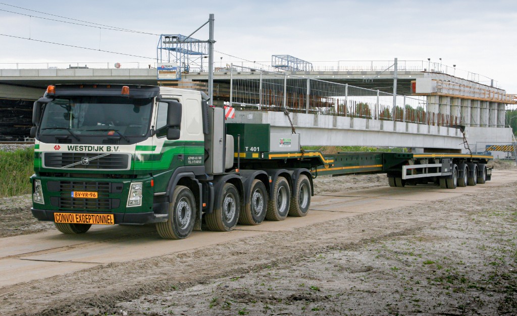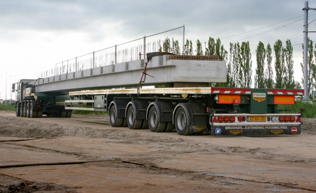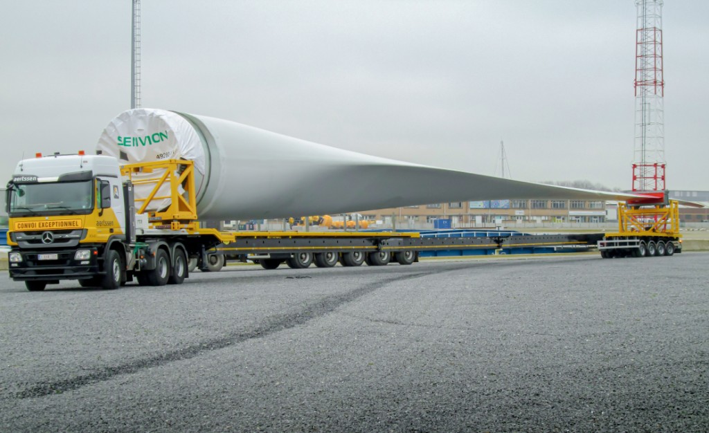 A special trailer is required for the transport of wind turbine blades. The weight to be transported is often low and the length extremely long. In 2005 Broshuis developed the "Triple Wing Carrier (TWC)" for transporting these blades. The trailer reaches a length of 53 m and thanks to the hydraulic steering, the trailer can reach places that are difficult to reach.