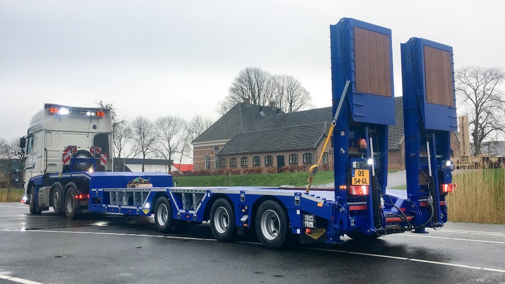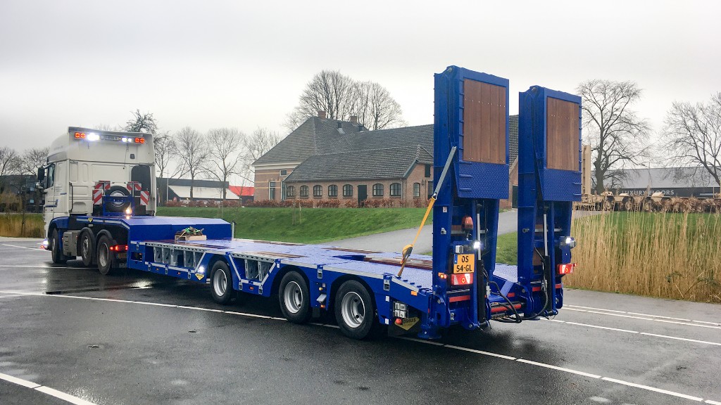 The 3-axle hydraulically steered construction semi low loader is the strongest of its kind. Wheel wells and crane arm recess allow you to carry taller loads.3-axle construction semi low loader, hydraulically-steered