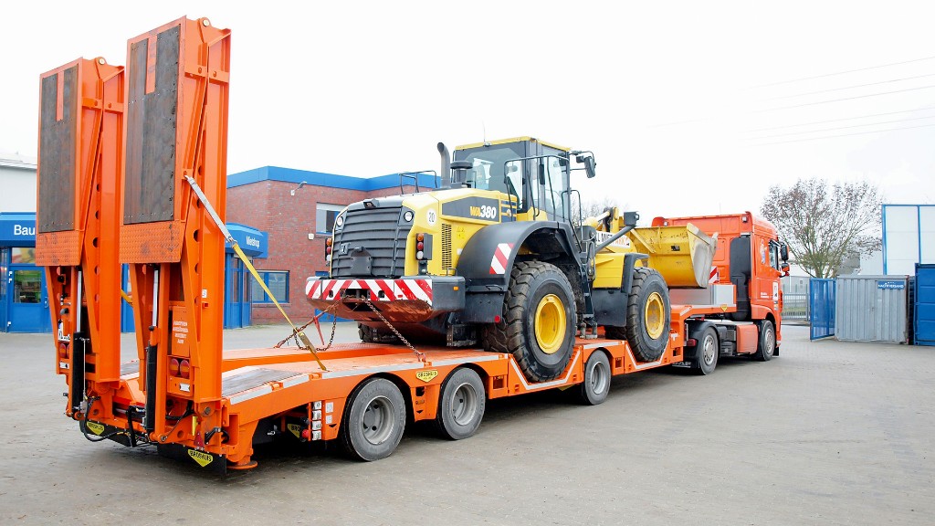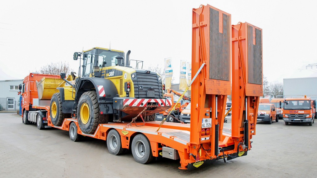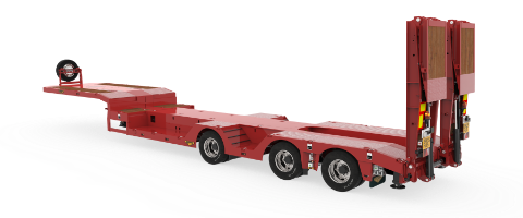 Our 3-axle hydraulically steered construction semi low loader is the strongest of its kind. Wheel wells and a crane arm recess allow you to carry taller loads.3-axle construction semi low loader hydraulically steered with ramps