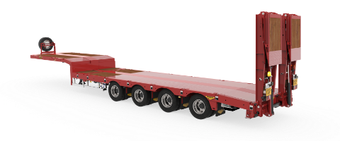 The 4-axle hydraulically steered semi low loader is the strongest of its kind. The hydraulic ramps make loading and unloading safer and easier.4-axle semi low loader, hydraulically steered, with ramps