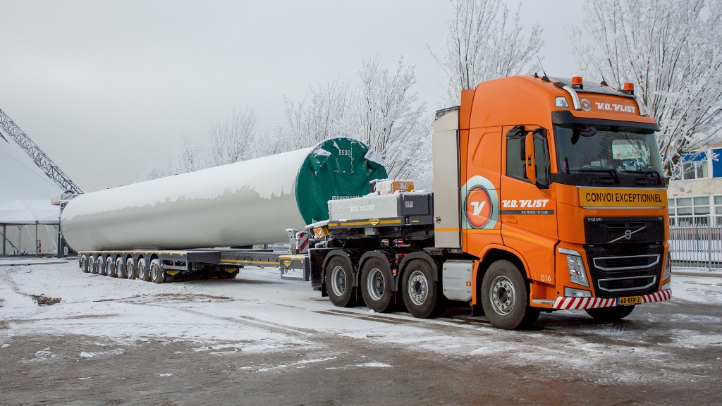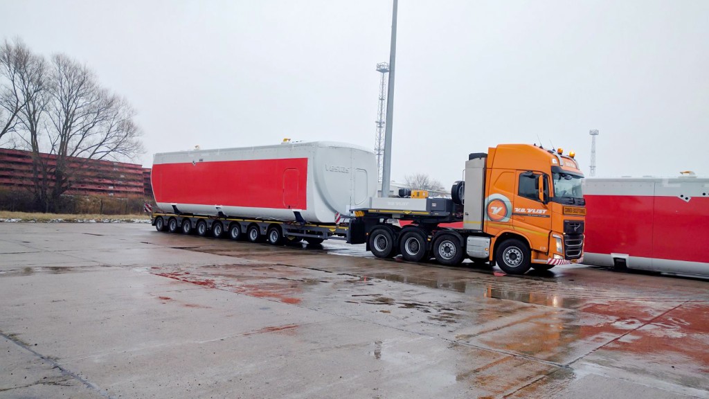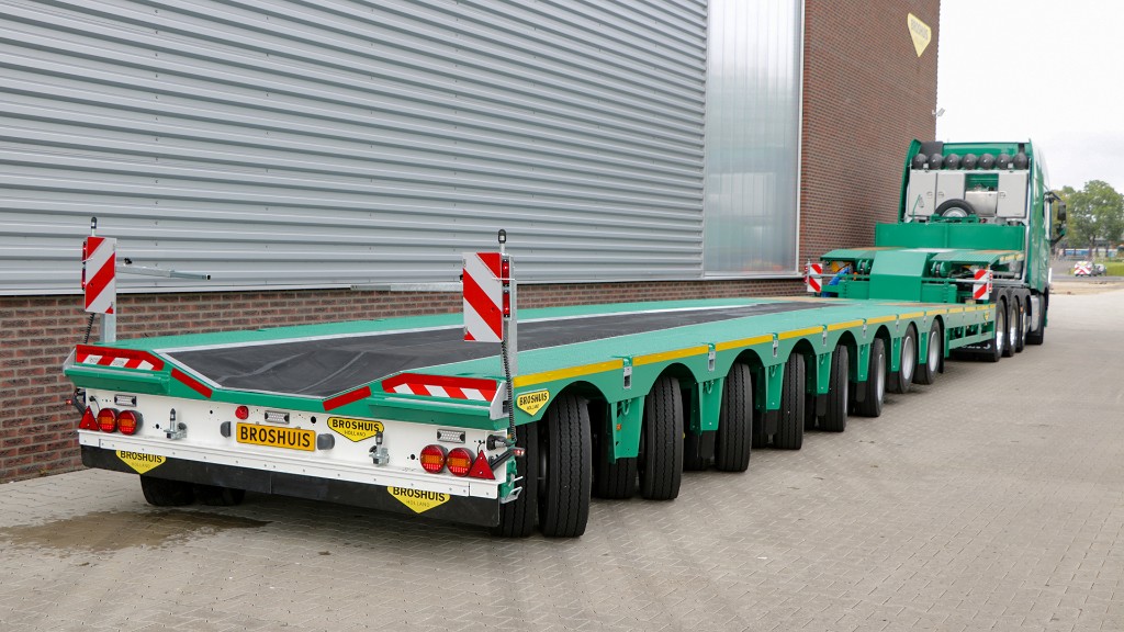 This 8-axle semi low-loader is designed for the transport of large wind turbine tower components. By extending the semi-trailer twice, a recess is created in the low bed. This recess (700mm loading floor height) ensures that you can transport the tower parts lower. Thanks to the stable hydraulic suspension, this semi-trailer is also able to transport the nacelles, making this multipurpose semi-trailer unique. Quality and safety were our two primary considerations in the design of this 8-axle semi low-loader.