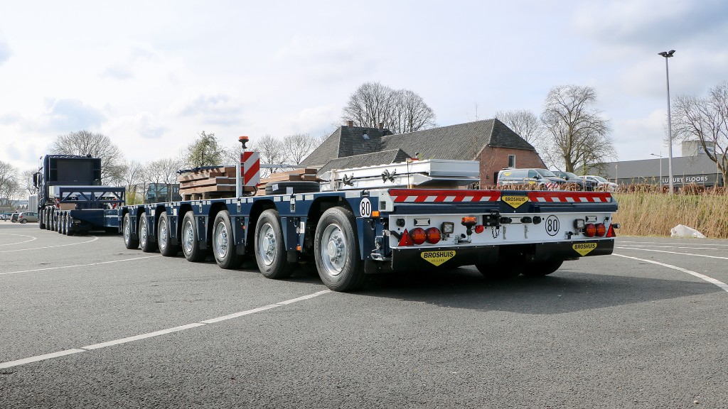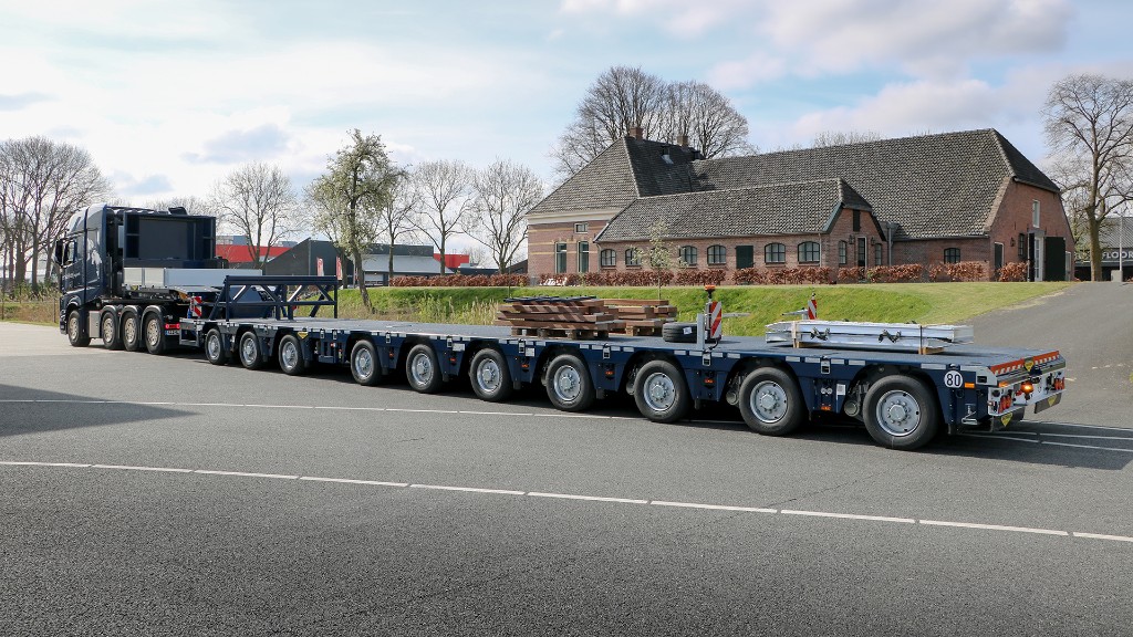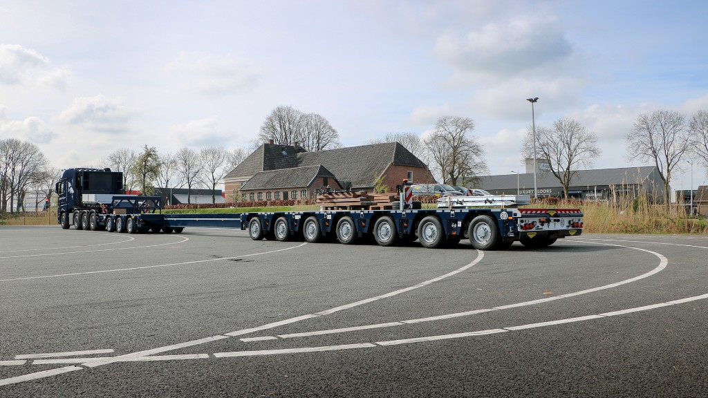 A semi low loader for loads of 100+ tonnes and an enormous length? Our double-extendable 10-axle pendle axle semi low loader is then the perfect trailer for you. These three axles steer with the truck, making the 10-axle pendular semi low loader very manoeuvrable. The trailer is double-extendable to a maximum length of 40 metres.