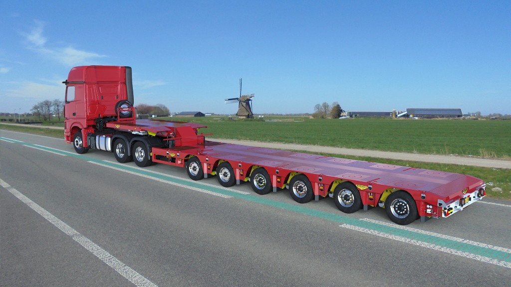 The transport of crane ballast and boom parts is a specialist occupation. Because the load is often known in advance, the trailer can be constructed specifically for it. We have designed a 6-axle pendle axle semi low loader for the transport of crane ballast and boom parts. This non-extendable trailer has a low loading floor, which allows the user to work more safely, without requiring fall protection. In addition, the multifunctional use of the semi low loader has been taken into account in the design. This also makes it easy to carry return-loads.