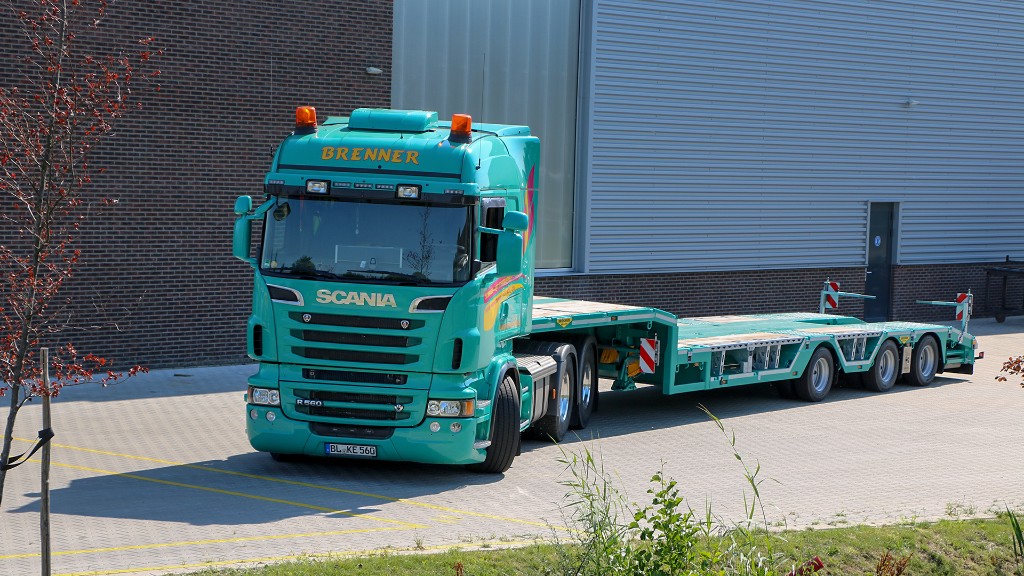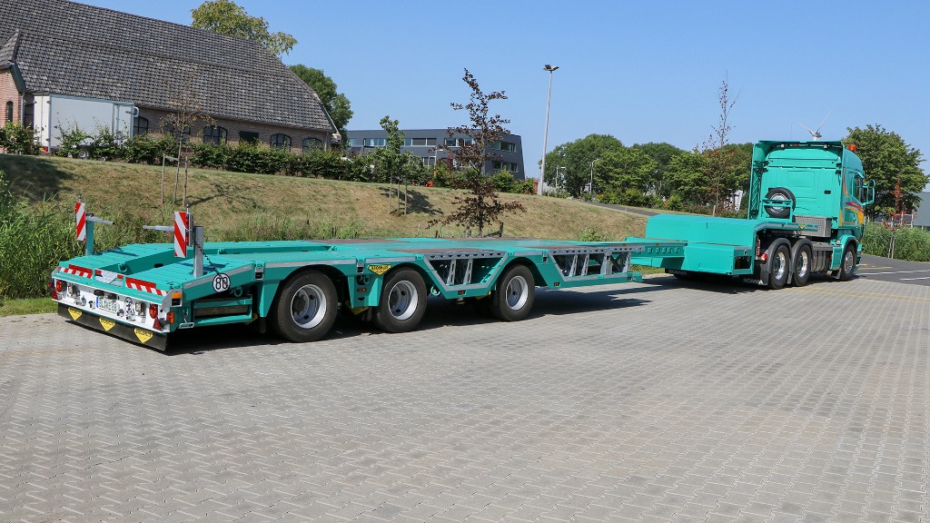 This 3-axle self-tracking construction semi low loader has double wheel wells and a crane arm recess. This makes the trailer extremely flexible in use. Because the front wheel well is extra large, vehicles with various wheelbases can be transported.3-Axle, self tracking construction semi low loader