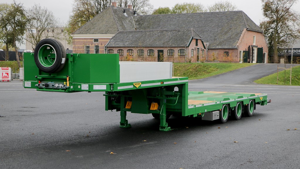 This low 4-axle self tracking steered construction semi low loader is equipped with small tyres. This allows taller construction machines to be loaded. The trailer has double wheel wells and a crane arm recess. By extending the trailer, the front wheel well can be made larger.