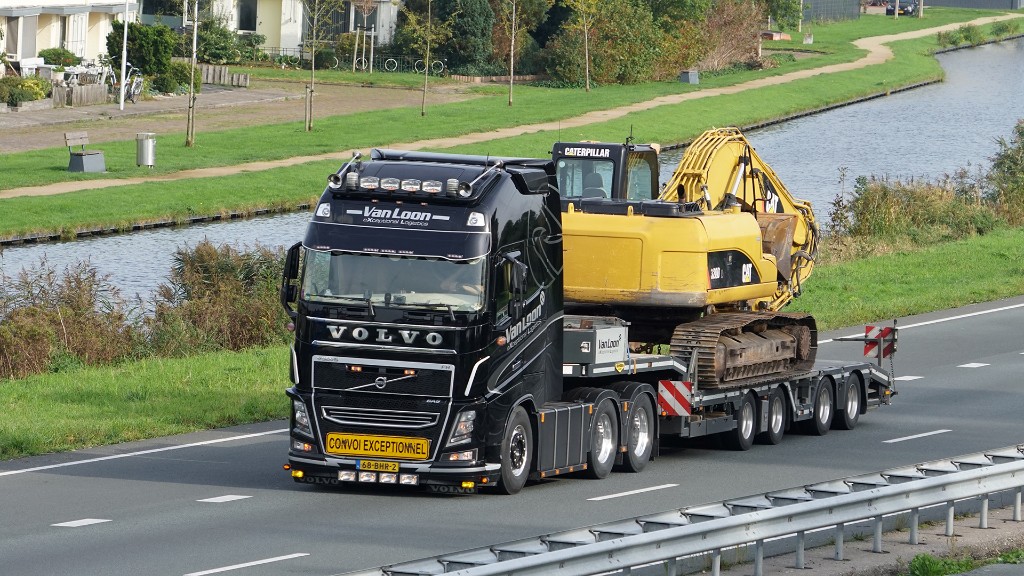 This low 4-axle self tracking steered construction semi low loader is equipped with small tyres. This allows taller construction machines to be loaded. The trailer has double wheel wells and a crane arm recess. By extending the trailer, the front wheel well can be made larger.
