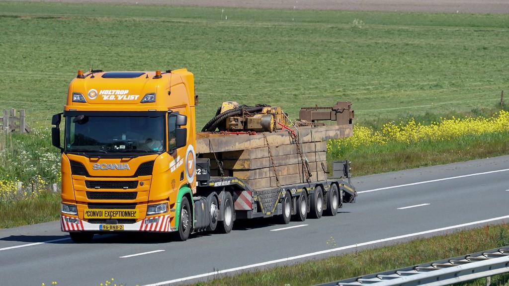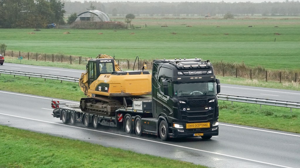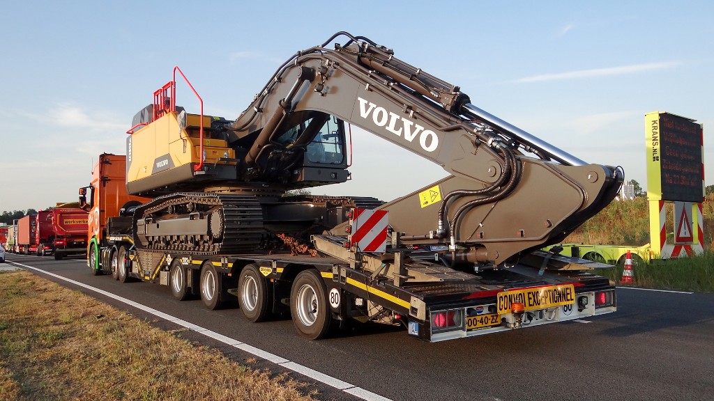 This 4-axle self-tracking construction semi low loader is equipped with wheel wells, a crane arm recess and hydraulic ramps. With this, you can transport almost all types of construction machines.