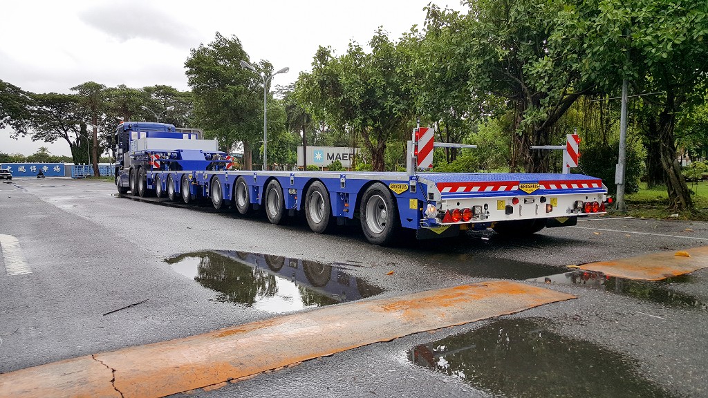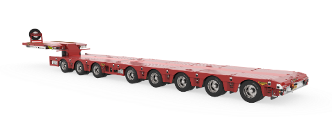 For the transportation of extremely heavy and high loads, the 8-axle semi low-loader on independent suspension is a widely-used semi trailer. This means you are choosing a proven concept in our range of 100 tonne trailers. Because the semi trailer is multifunctional, almost any load up to 100 tons can be transported with this 8-axle trailer. Thanks to our years of experience in building semi low loaders, you can be assured of the best quality. This 8-axle variant is designed as a 3 + 5 configuration, where the first two axles remain attached to the gooseneck during extension, acting as a dolly. This provides the ideal weight distribution. The dolly can even extend one times. These three axles steer with the truck, making the 8-axle semi low loader highly manoeuvrable. The trailer is single-extending, reaching a length of up to 24 meters.