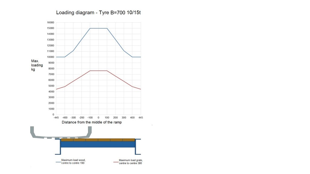 The cargo that the ramps can handle is essential for the right choice. We calculate for every type of ramp what the maximum loading capacity is with a wooden floor and a metal grate floor. The load capacity is also dependant on the track gauge of the vehicle being loaded.