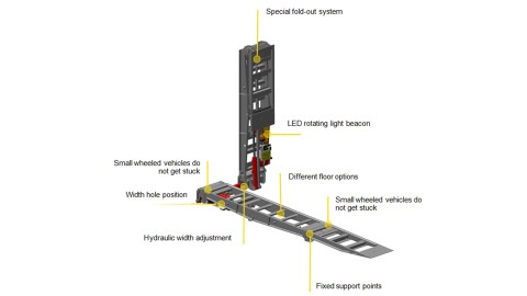 This avoids causing damage to the road or your ramps. Various special strips are also fastened to prevent small wheeled vehicles getting stuck. An optional dock shelter support foot is available to facilitate loading and unloading at a loading dock.